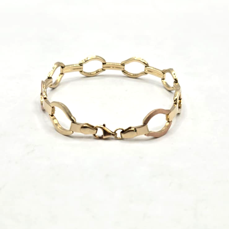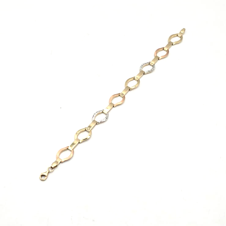 This elegant bracelet features a sophisticated tri-tone design crafted from 14K gold, combining yellow, white, and rose gold tones for a versatile and dynamic look. Expertly made to balance color and texture, it offers both lasting quality and a refined finish. Perfect for enhancing any outfit, this piece brings a contemporary edge while maintaining classic appeal.
